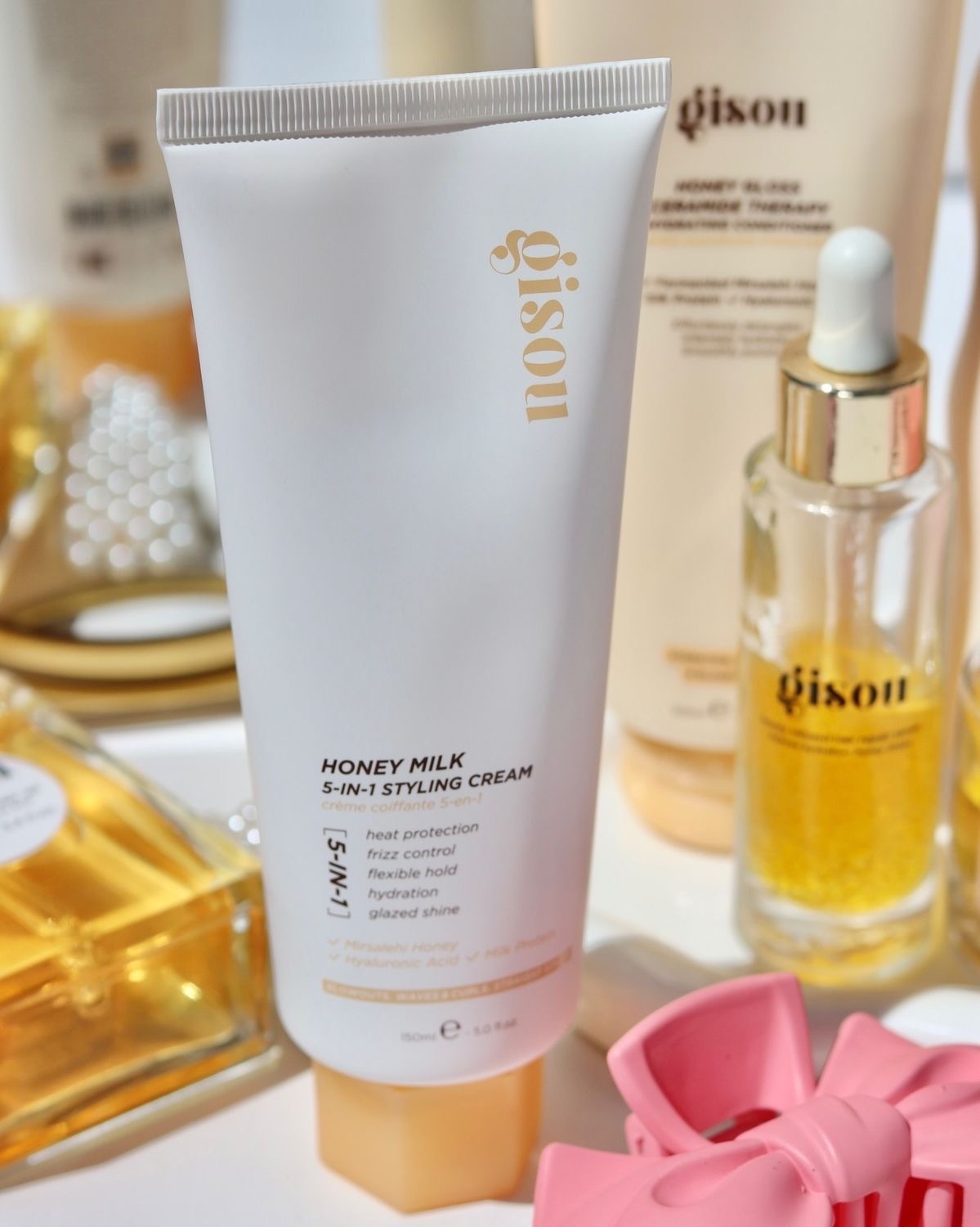 Honey Milk 5-in-1 Styling Cream от Gisou Защищает от тепла до 230°C Увлажняет и питает волосы медом Mirsalehi Придает зеркальный блеск Убирает пушение и держит укладку до 3 дней Делает волосы мягкими и послушными, без утяжеления Нежный коктейль меда, ванили и персика — волосы не только выглядят роскошно, но и пахнут божественно.